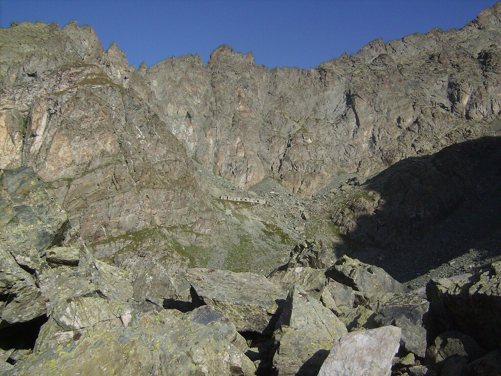 Giunti sul versante italiano dopo aver attraversato la galleria (è utile essere dotati di una torcia frontale) si inizia la ripida discesa che porta prima ad incontrare la Caserma delle Traversette e quindi raggiungere la conca di Pian Mait (2700 m.).