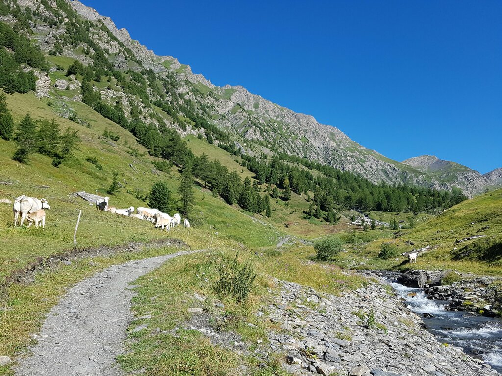 Il sentiero corre in Traverso con bella vista sul borgo di Chianale, tocca alcune baite isolate e inizia a scendere verso il Torrente Soustra che si oltrepassa su un ponticello di legno nei pressi delle Grange del Rio. (2007 m).