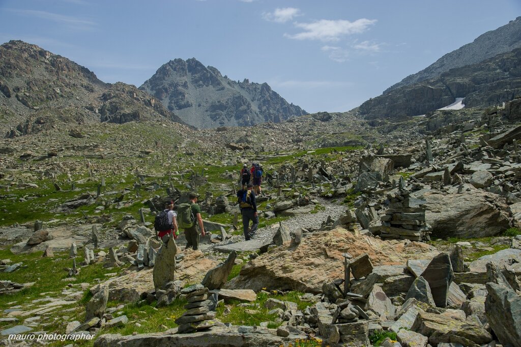 Proseguendo sul sentiero che passa a breve distanza dal Bivacco Bertoglio, si superano tre specchi d’acqua, il Lago Bertin (2701 m), un laghetto senza nome e il Lago Lungo (2743 m) e si raggiunge l’ampia depressione del Passo di San Chiaffredo (2764 m) sullo spartiacque tra la Valle Varaita e Po. La mulattiera taglia quasi in piano le pendici meridionali di Punta Trento e giunge in breve al Passo Gallarino (2727 m).